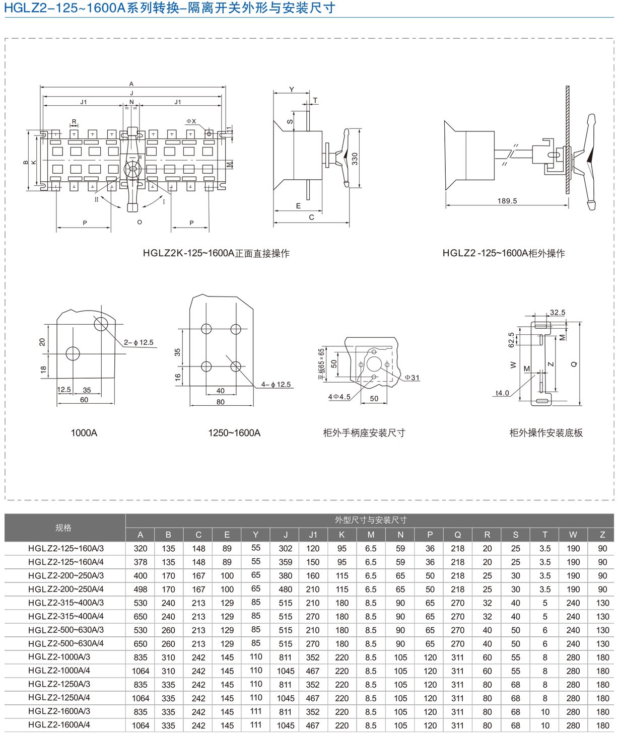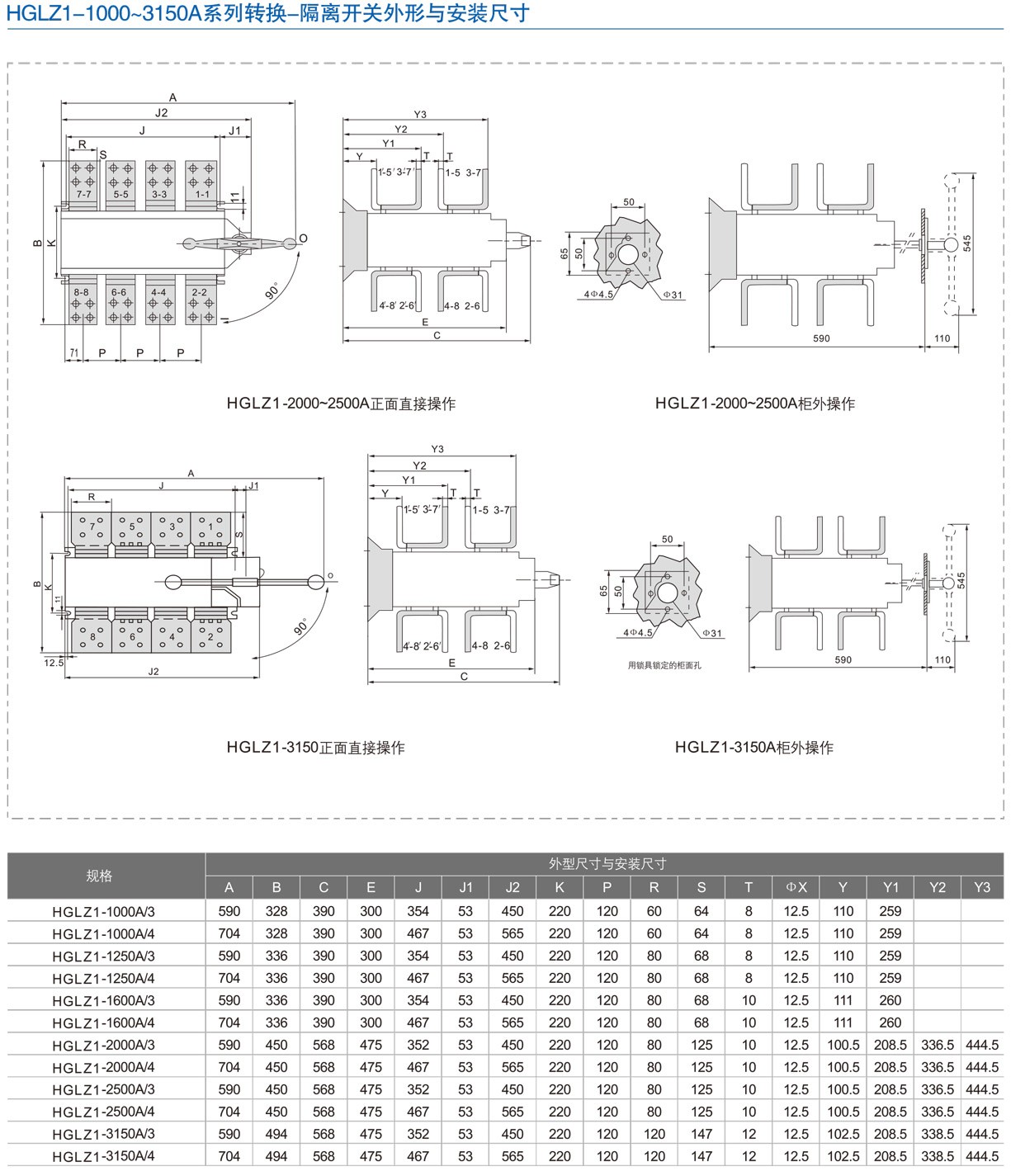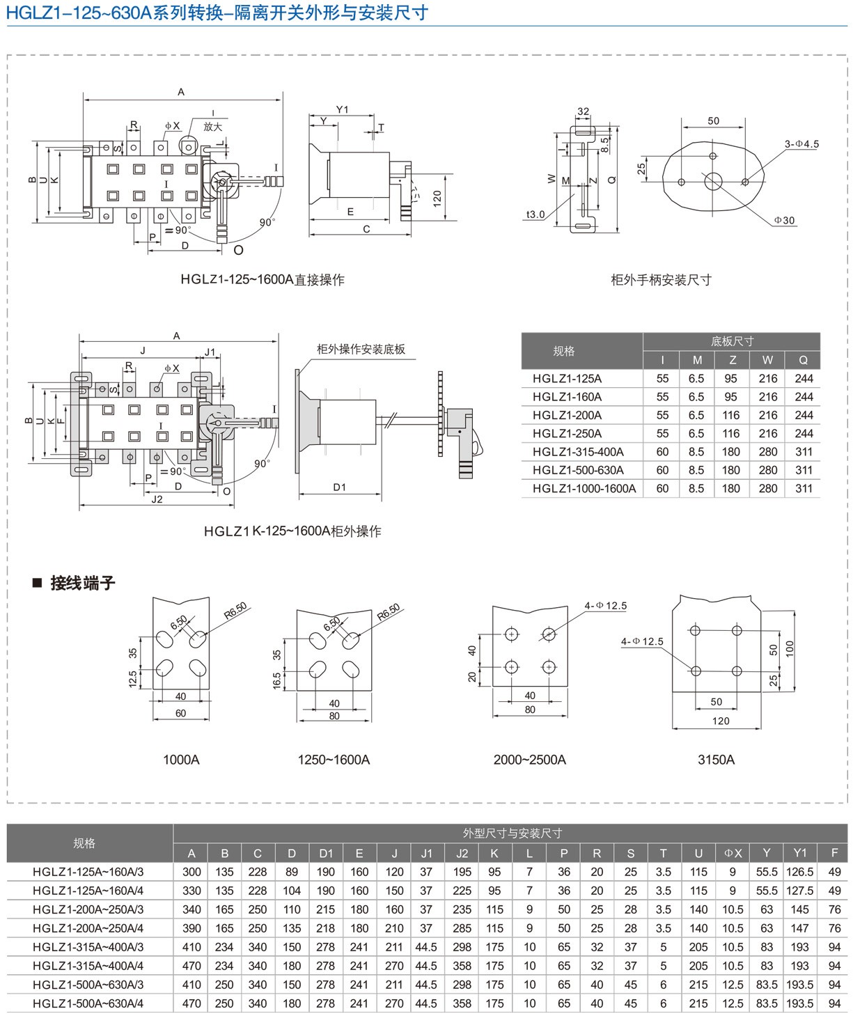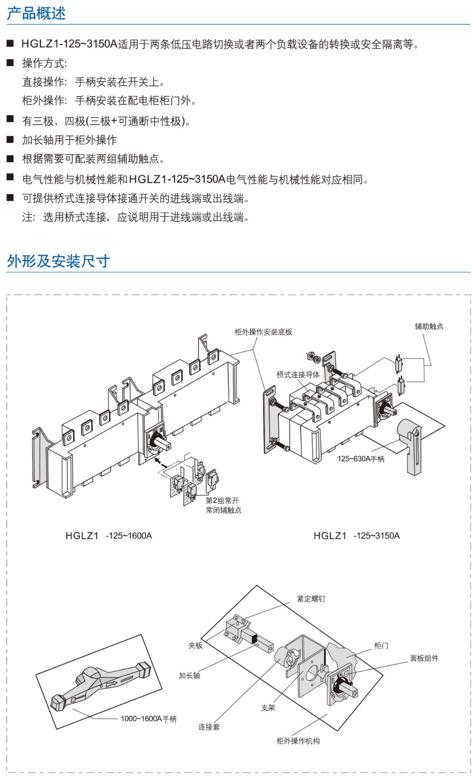HGLZ1-125-3150A適用于兩條低壓電路切換或者兩個負載設備的轉換或安全隔離等。 操作方式: 直接操作:手柄安裝在開關上。 柜外操作:手柄安裝在配電柜柜門外。 有三、四(三+可通斷中性)。 加長軸用于柜外操作 根據需要可配裝兩組輔助觸點。 電氣性能與機械性能和H G LZ1 -125~3150A電氣性能與機械性能對應相同。 可提供橋式連接導體接通開關的進線端或出線端。 注:選用橋式連接,應說明用于進線端或出線端。